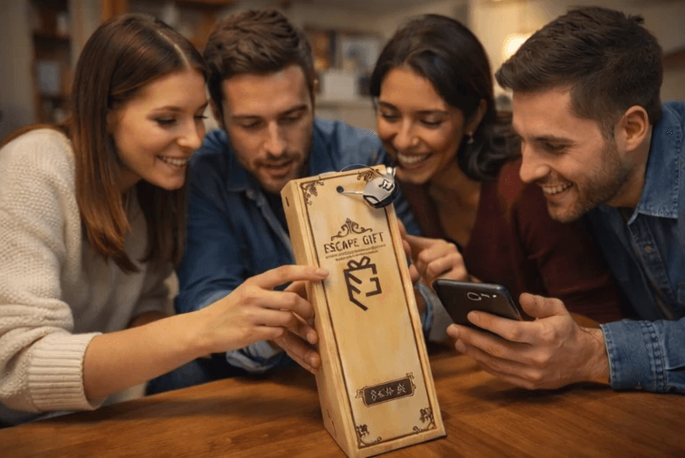 "Onze innovatieve cadeauverpakking combineert traditionele geschenken – denk aan wijn, bier en pralines – met een escape game vol fysieke én digitale puzzels."